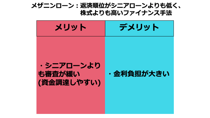 メザニンローンとは、シニアローンよりも返済順位が下がる、劣後ローンとなります。