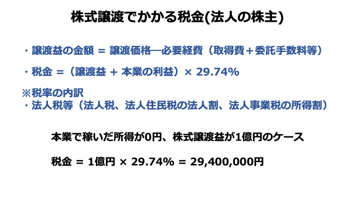 法人株主にかかる税金は、株式譲渡益に加え、本業で稼いだ利益と合算した所得金額に対して、法人税実効税率29.74%(外形標準適用法人の場合)[3]を乗じて計算されます。
