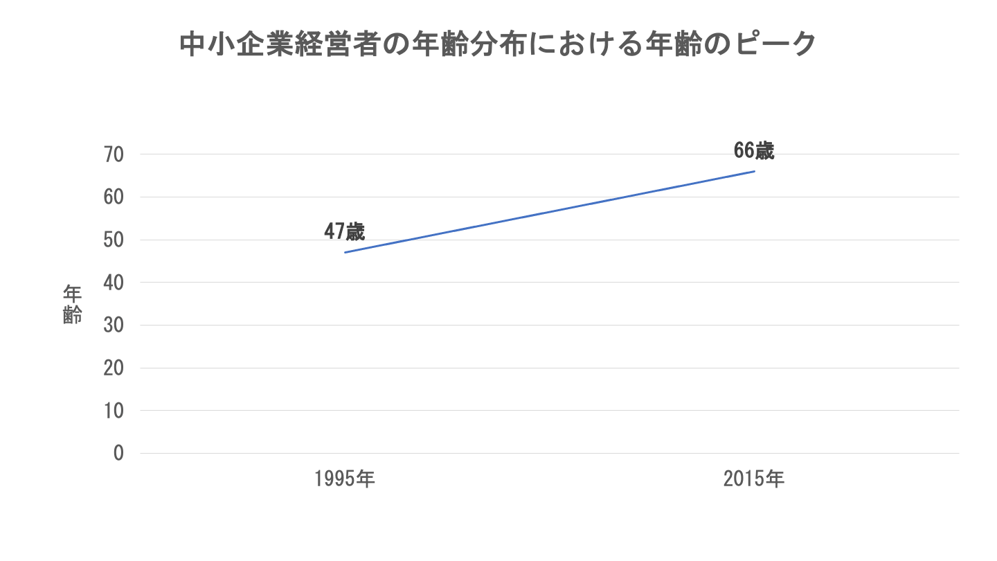 中小企業の経営者年齢の分布において、1995年は年齢のピークが47歳であったのに対し、2015年は66歳と20歳近く上がっています[1]。
