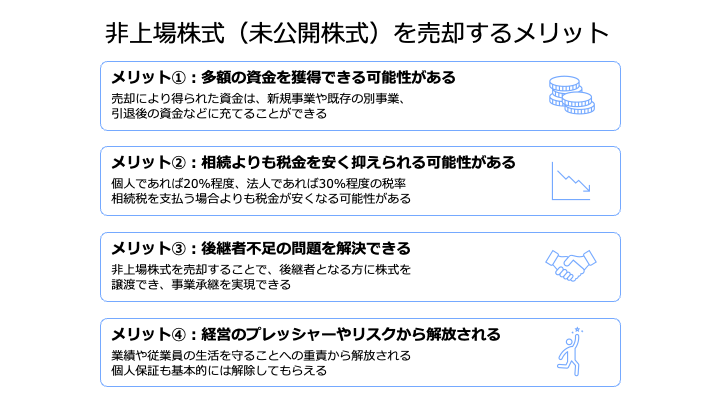 また、非上場株式の売却には、法務・税務の専門的な手続きも伴います。