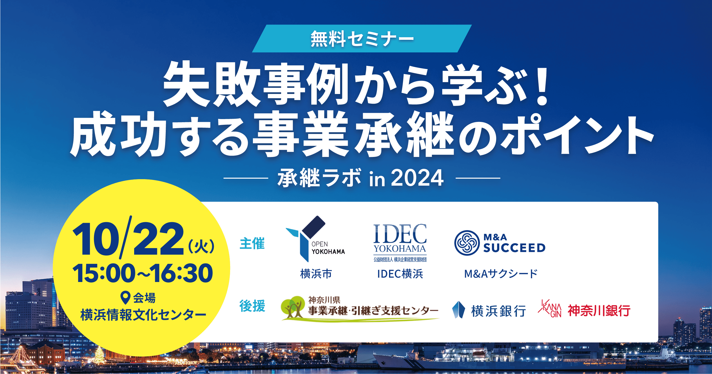 法人・審査制M&Aマッチングサイト「M&Aサクシード」を運営する株式会社M&Aサクシードは、横浜市および公益財団法人横浜企業経営支援財団(以下、IDEC横浜)と連携し、無料セミナーを開催することをお知らせいたします。