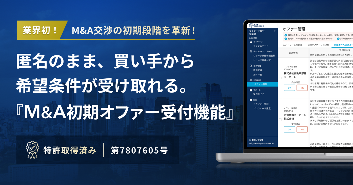 法人限定M&Aプラットフォーム「M&Aサクシード」は、譲渡を検討中のオーナー経営者が、自社の匿名情報とともに初期段階で知りたい具体的な条件や意向をあらかじめ設定し、譲受候補企業(買い手)から初期段階で収集できる「M&A初期オファー受付機能」の提供を開始しました。