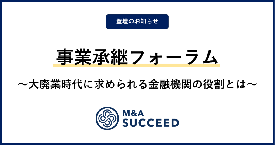 Visionalグループの株式会社M&Aサクシード(所在地:東京都渋谷区/代表取締役社長:金 蓮実)が運営する法人・審査制M&Aマッチングサイト「M&Aサクシード」(https://ma-succeed.jp/))は、2023年10月27日(金)に東京国際フォーラム(東京都千代田区)で開催される「事業承継フォーラム~大廃業時代に求められる金融機関の役割とは~」に登壇することをお知らせいたします。