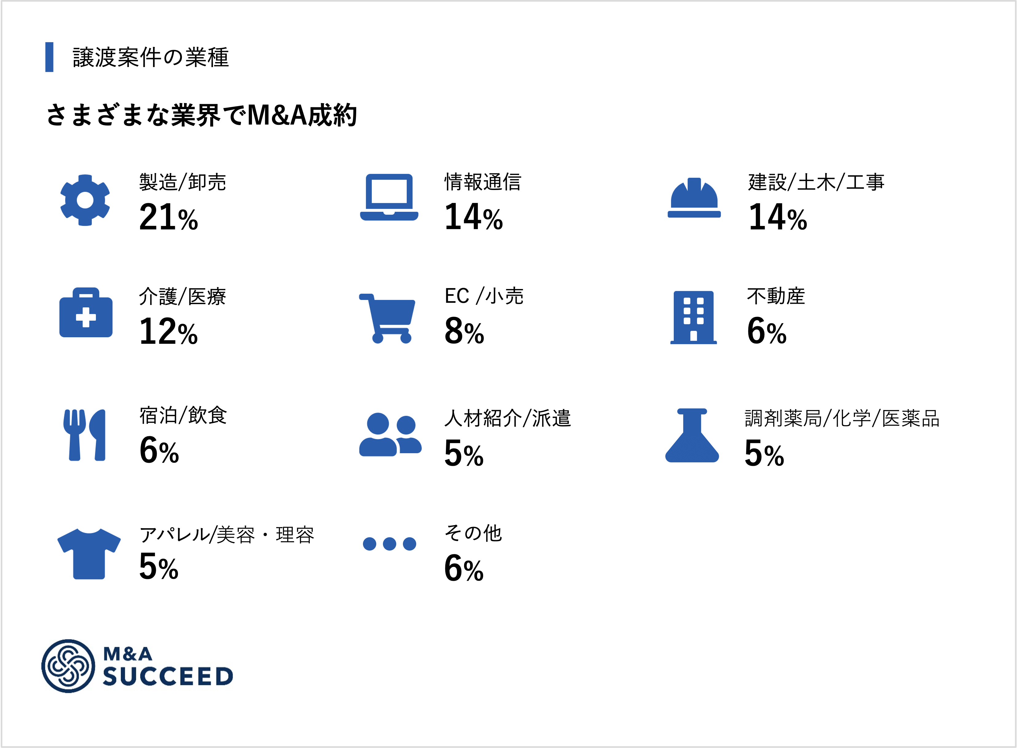 Visionalグループの株式会社M&Aサクシード(所在地:東京都渋谷区/代表取締役社長:金 蓮実)が運営する法人・審査制M&Aマッチングサイト「M&Aサクシード」は、2023年1月から12月までに「M&Aサクシード」を通じて成約したM&A全件の内訳データを公開いたします。