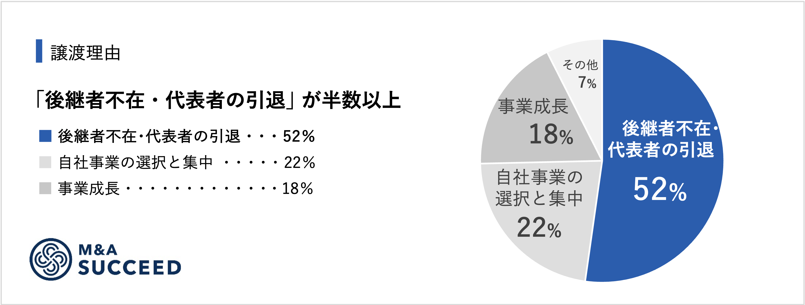 ・譲渡理由:「後継者不在・代表者の引退」52%、「自社事業の選択と集中」22%、「事業成長」18%