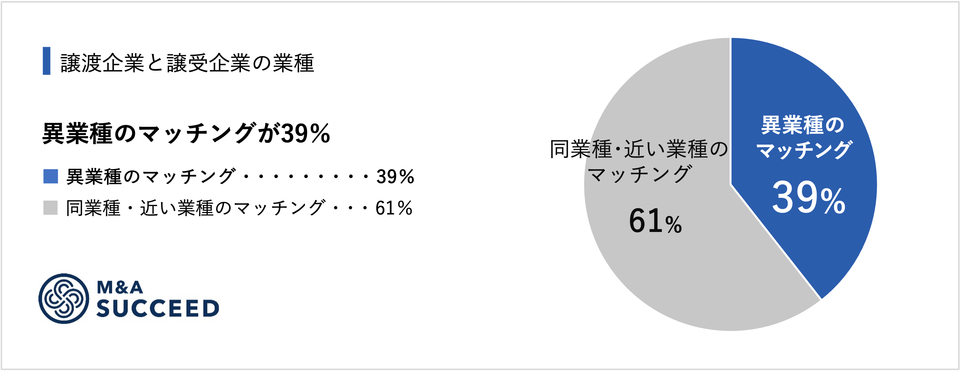 「M&Aサクシード」は、一度に全国のM&Aの可能性を探せるM&Aマッチングサイトです。そのため、地域や業種を超えた多様なマッチングが生まれており、2023年の成約実績を見ると、異業種同士のマッチングが約4割を占めています。