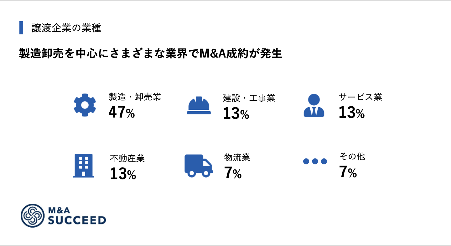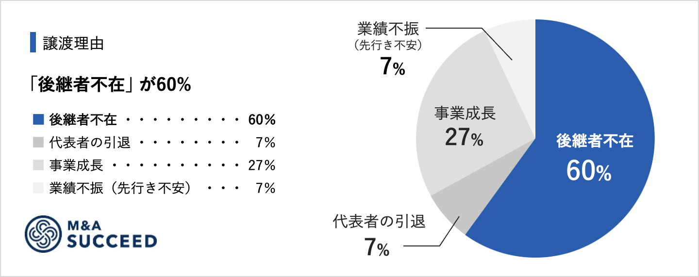 ・譲渡理由:「後継者不在」60%、「事業成長」27%、「代表者の引退」7%、「業績不振(先行き不安)」7%