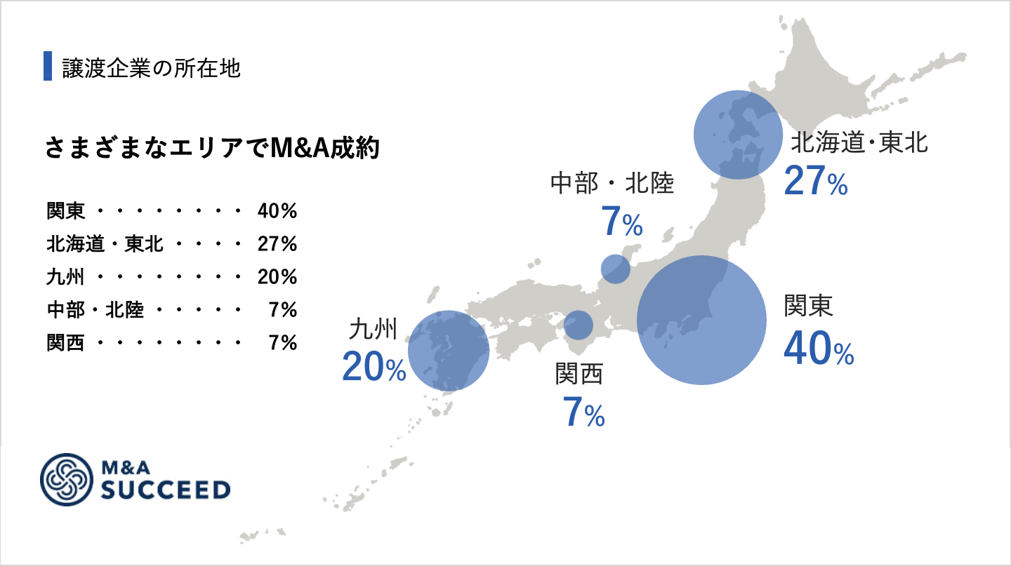 ・譲渡企業の所在地:全国(関東40%、北海道・東北27%、九州20%、中部・北陸7%、関西7%)