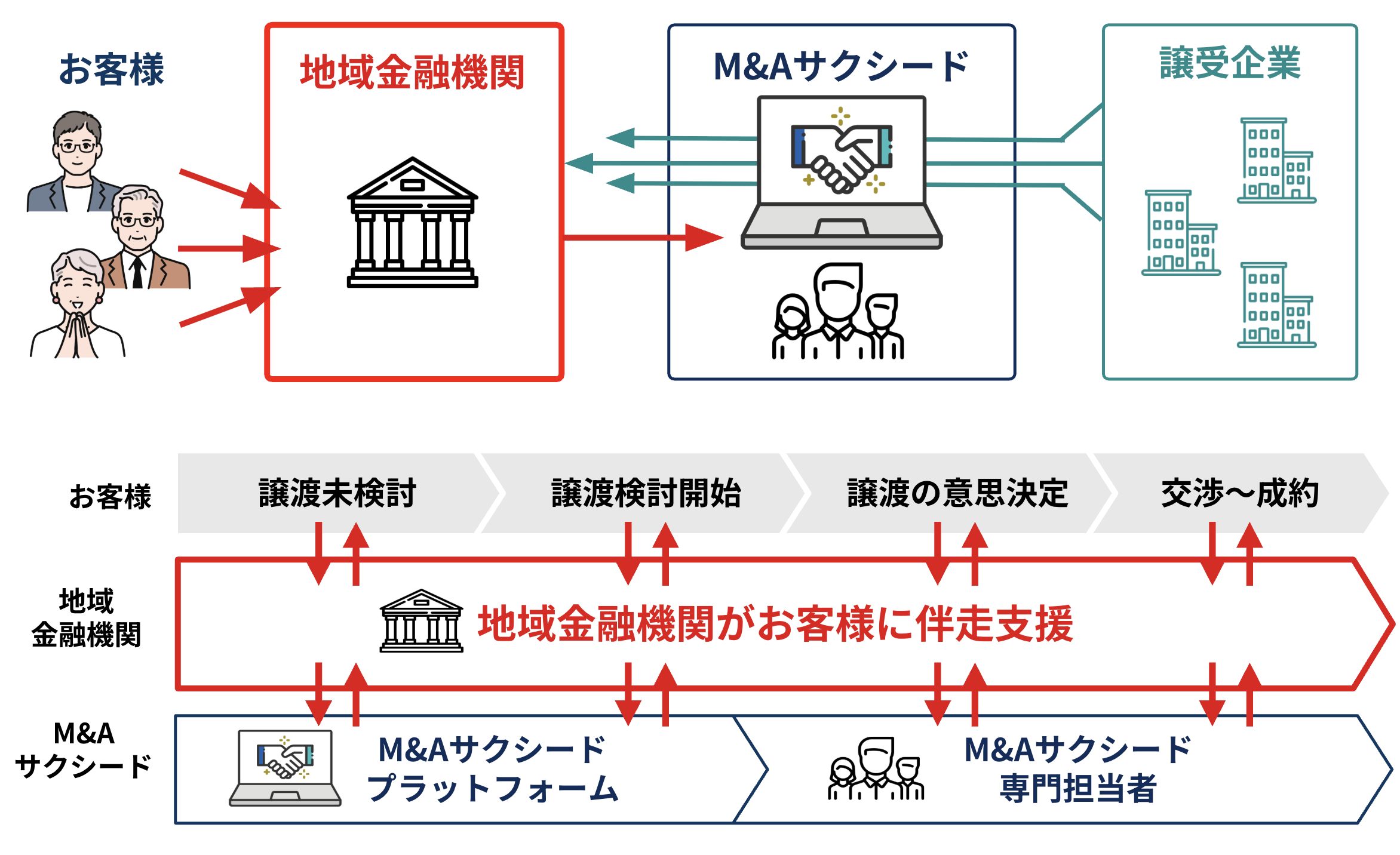 M&Aサクシードでは、M&A市場のオンライン化を通じて、M&A当事者に開かれた選択肢を提供してきました。このたび提供を開始する「地銀版M&Aサクシード」は、従来のプラットフォームや仲介会社との連携では実現が難しかった、潜在ニーズの段階から成約に至るまで、地域金融機関が一気通貫でお客様に伴走できるようにする新サービスです。