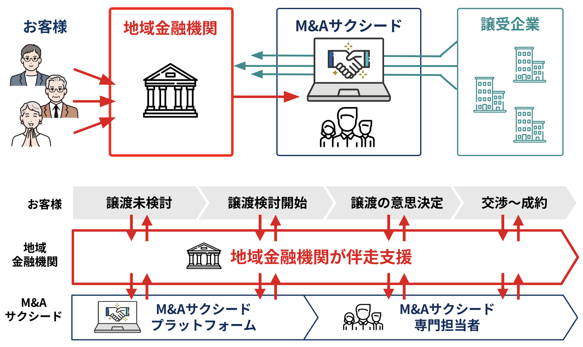 地域金融機関が顧客との接点を維持したまま、自行内マッチングと同時に「M&Aサクシード」を通じた全国の譲受候補企業とのマッチングが可能です。商圏を越えた選択肢の最大化により、譲受企業探しの長期化を防ぎ、適切なタイミングでのM&Aを支援します。