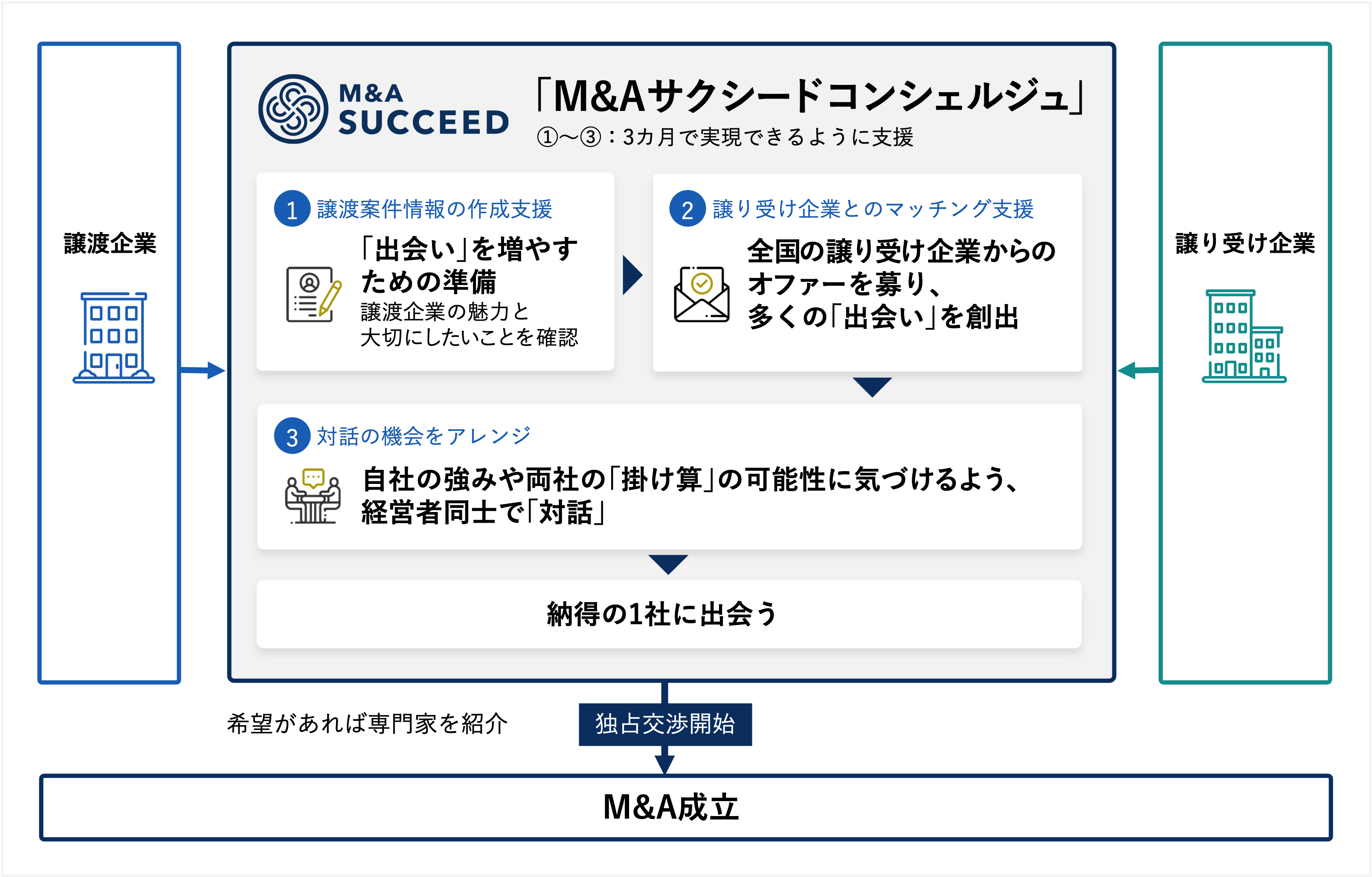 これまでは、譲渡企業から受任したM&Aアドバイザリー業務を行う金融機関が直接「M&Aサクシード」を利用し、譲り受け企業を探していましたが、限られた人員でM&Aアドバイザリー業務を行う金融機関に「M&Aサクシード」をご利用いただくのは難しいケースもありました。そこで、金融機関向けの「M&Aサクシードコンシェルジュ」を今夏より開始します。金融機関に代わり、「M&Aサクシードコンシェルジュ」が譲渡企業に伴走し、納得の1社に出会えるよう支援します。なお、独占交渉開始後は、金融機関が譲渡企業をサポートします。