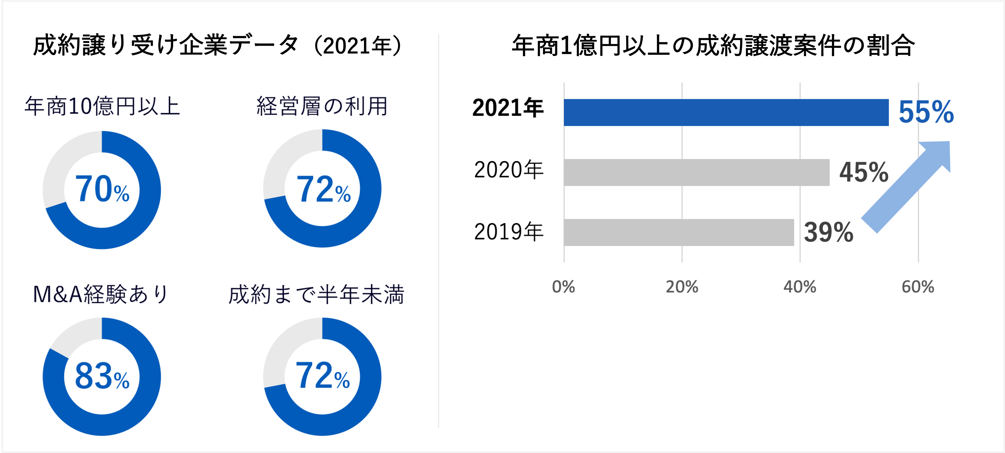 2021年の成約譲渡案件のうち、55%が年商1億円以上、成約譲り受け企業の70%が年商10億円以上でした。年商1億円以上の成約譲渡案件数は、この2年間で3.6倍に増加しています。さらに、譲渡金額1億円以上が56%で、この2年間で3.7倍に増えています。