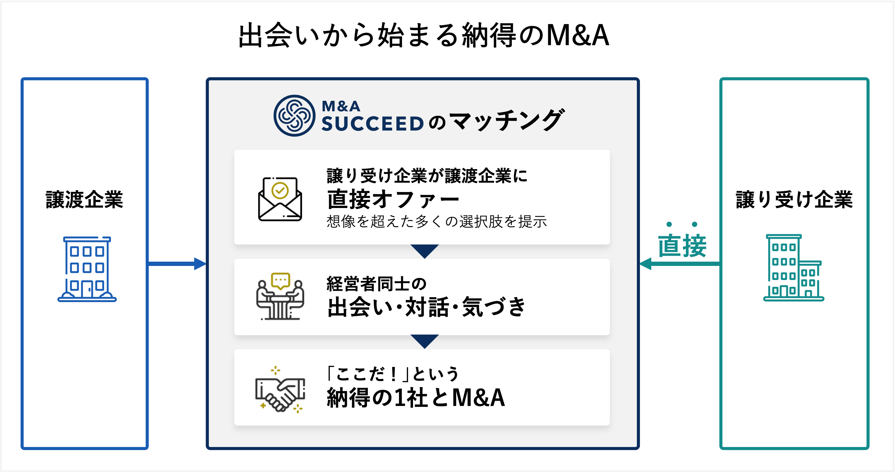 手塩にかけて事業を育ててきた経営者様にとって、企業(暖簾)は人生そのものです。その大切な人生・暖簾を、心から託したいと思える経営者様と出会っていただきたい。弊社は「人生を託せる、出会いのために。」をミッション(存在意義)に掲げています。大切な人生・暖簾だからこそ、私たち「M&Aサクシード」は、多くの経営者様との「出会い」と「対話」にこだわり、その過程を大切に経営者様の「納得」の瞬間を生み出したいと考えています。「M&Aサクシード」では、譲渡を検討中の経営者様に、全国の譲り受け企業様から「貴社に興味があります。一度お話ししてみたいです」という「ラブレター」を直接送れるようにしています。この仕組みをうまく使い、三つの事柄を大切にしてきました。具体的には、以下のとおりです。