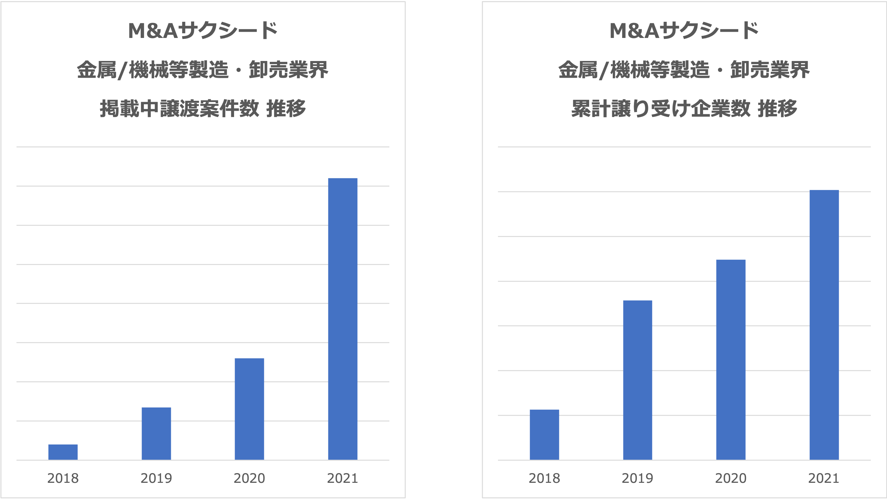 Visionalグループの株式会社M&Aサクシード(所在地:東京都渋谷区/代表取締役社長:金 蓮実)が運営する法人・審査制M&Aマッチングサイト「M&Aサクシード」(https://ma-succeed.jp/)は、2022年5月時点で「M&Aサクシード」上に掲載されている金属/機械等製造・卸売業界関連の譲渡案件数が前年同月比2.7倍、前々年同月比5.3倍であったことをお知らせします。また、2022年5月時点で「M&Aサクシード」に登録している累計譲り受け企業8,000社超のうち、金属/機械等製造・卸売業界関連の企業も604社(前年同月比1.3倍、前々年同月比1.7倍)と増加しています。