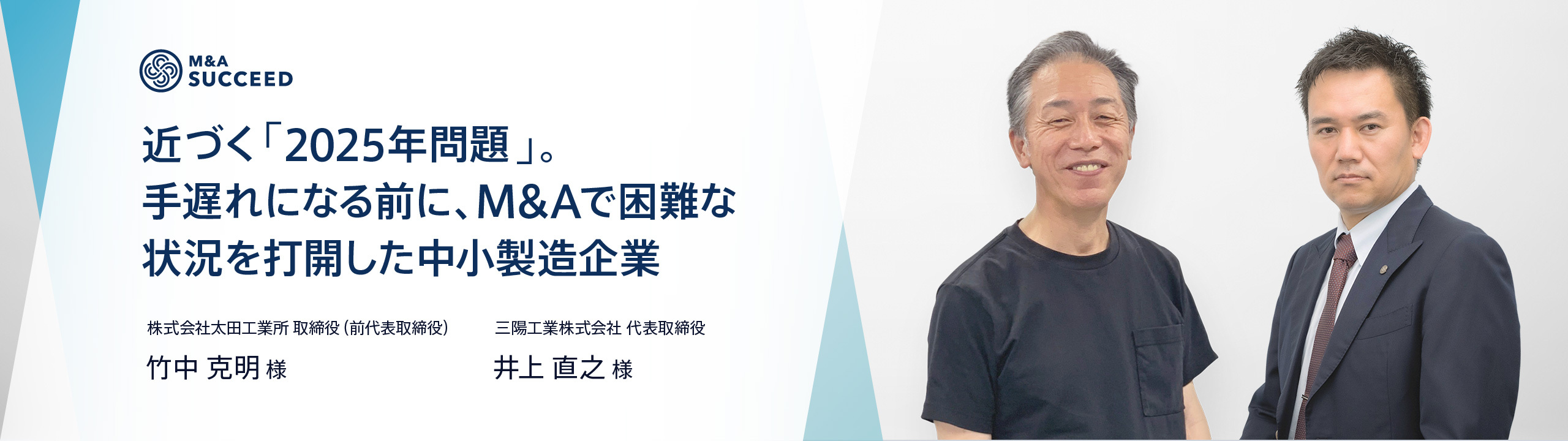 Visionalグループの株式会社M&Aサクシード(所在地:東京都渋谷区/代表取締役社長:金 蓮実)が運営する法人・審査制M&Aマッチングサイト「M&Aサクシード」(https://ma-succeed.jp/)を通じて、三陽工業株式会社(所在地:兵庫県、略称:三陽工業)が、鉄道車両部品等の製造を手掛ける株式会社太田工業所(所在地:愛知県、略称:太田工業所)の全株式を2022年6月1日に取得したことをお知らせします。太田工業所は三陽工業グループに入ったことで、すでにシナジー効果が出ています。本事例は、製造業の54%が後継者未定(2021年)(注1)という状況のなか、全国の町工場の技術を承継する革新的なモデルといえます。このたび、二社の対談を公開しました。詳細に関してはこちらをご参照ください。https://ma-succeed.jp/content/agreement/post-11799