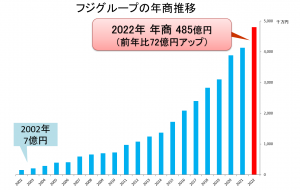 同社は全国への拠点展開によるスケールメリットを活かし、生産性向上を実現させています。(グループ全体の売上高:2010年6月期73億円→2022年6月期485億円)。