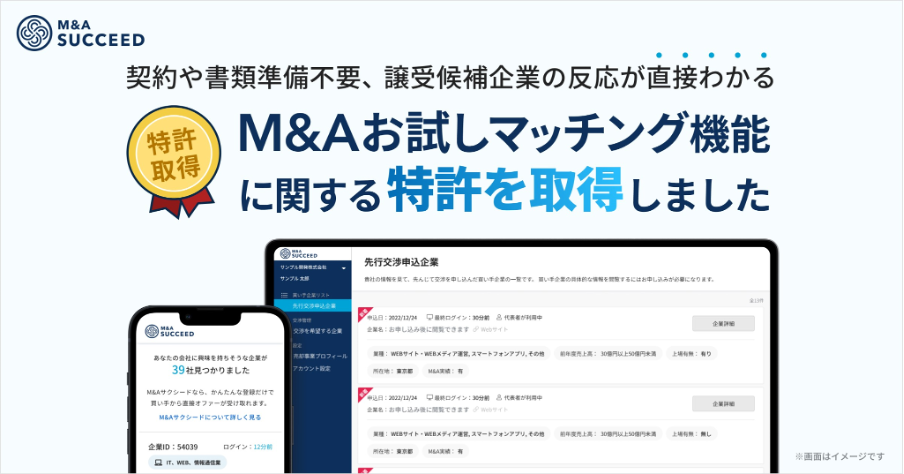 Visionalグループの株式会社M&Aサクシード(所在地:東京都渋谷区/代表取締役社長:金 蓮実)が運営する法人・審査制M&Aマッチングサイト「M&Aサクシード」(https://ma-succeed.jp/)は、譲渡検討企業のオーナー経営者が、契約締結前にマッチングを開始できる「M&Aお試しマッチング機能」に関する特許を取得したことをお知らせいたします。 本機能によって、譲渡検討企業のオーナー経営者は、自身の意思により、譲受候補企業の実名や詳細の閲覧が可能となり、自ら自社の可能性と幅広い選択肢を確認することができます。