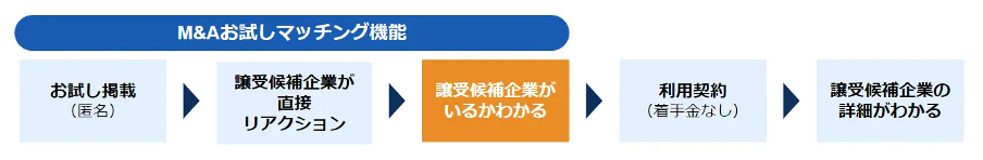 M&Aを検討中または今後検討する可能性がある企業のオーナー経営者が、利用契約前に匿名で情報を掲載し、自社に興味を持つ譲受候補企業の有無や属性、反応を知ることができる業界初(※1)の機能です。
