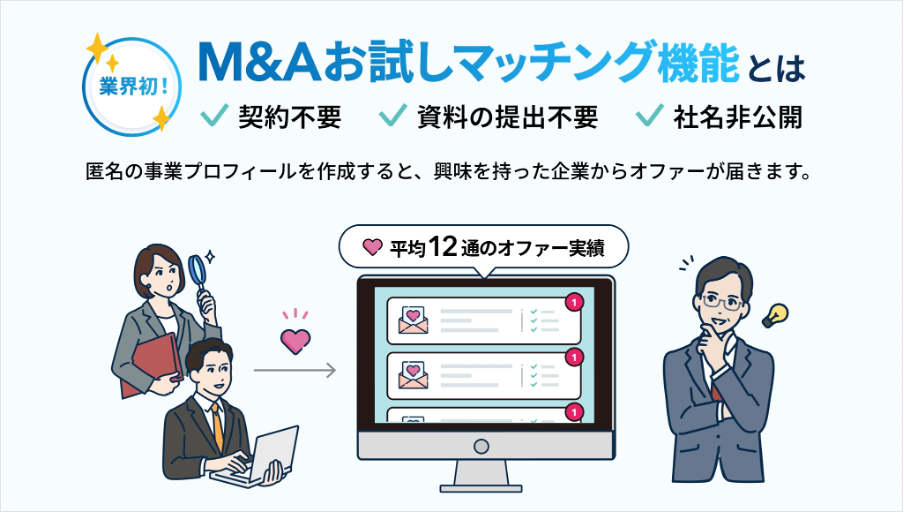 「M&Aお試しマッチング機能」を活用することで、客観的な自社の価値を知り、経営の選択肢と可能性を最大化していただきたいと考えています。