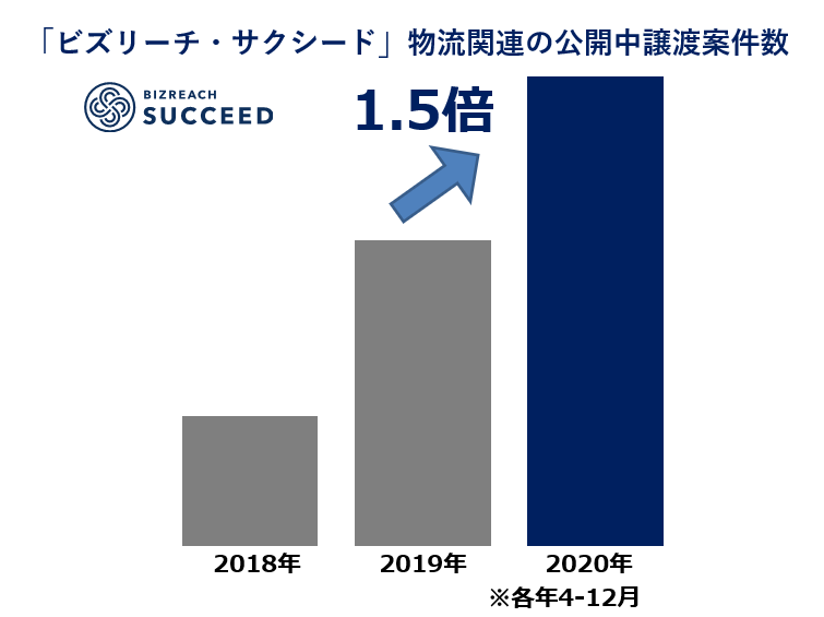 Visionalグループのビジョナル・インキュベーション株式会社(所在地:東京都渋谷区/代表取締役社長:永田 信)が運営する事業承継M&Aプラットフォーム「ビズリーチ・サクシード」(https://ma-succeed.jp/)は、2020年4月~12月に「ビズリーチ・サクシード」に公開されていた物流関連の譲渡案件数が前年同期比1.5倍、前々年同期比3.6倍で、全公開譲渡案件数のうち4%超であったことをお知らせします。また、「ビズリーチ・サクシード」の累計譲り受け企業6,600社のうち物流関連会社は220社超で、物流業界のM&Aニーズが高いことがうかがえます。(✳︎)「ビズリーチ・サクシード」は「M&Aサクシード」にサービス名を変更しました(2022年6月7日追記)
