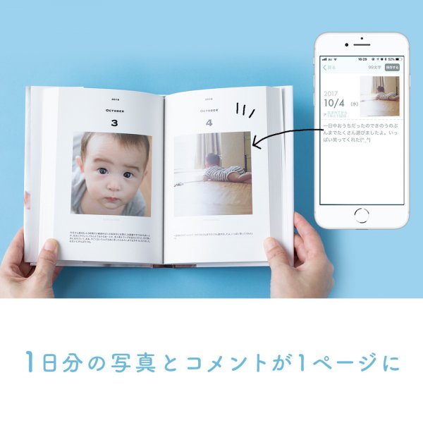 「365日分の写真をコメント付きでプリントアウトできるアプリを探したところ、BABY365にたどりつきました。これに尽きます。お値段、決してお安くはありませんが、365枚の写真をプリントアウトと考えれば、早割利用で1ページ54~47円。これがコメント入り、きれいな製本箱入りがコミの料金なら、自力でやるより断然楽だし、割高感はありませんでした。本の形で手元に残り、いつか子に見てもらえると思うと作って良かった、2年目も頑張ります」