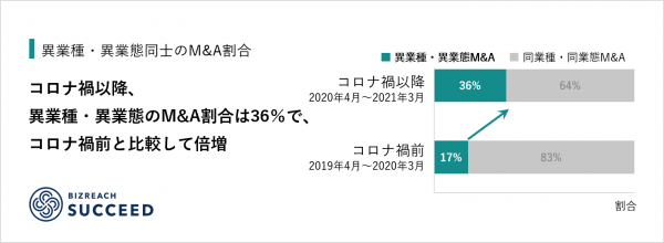 コロナ禍の影響下における「ビズリーチ・サクシード」経由の中小企業のM&A動向を見ると、これまで一本足打法だった企業がM&Aによって多角化したり、業態転換や事業転換を図ったりするなど、M&Aを経営戦略の中核に置く「M&A経営」を取り入れる譲り受け企業が増加しています。その傾向を表すように、異業種・異業態同士のM&Aがコロナ禍前と比較して倍増しています。