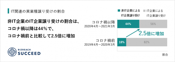 2021年コロナ禍の中小企業動向:M&AでスピーディーにDX・IT化、業態・事業転換する企業が急増 ~非IT企業によるIT企業のM&A件数がコロナ禍前比2.5倍~(「ビズリーチ・サクシード」M&A成約動向)