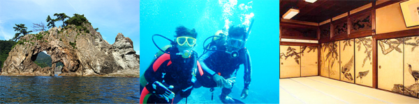 香住海岸や今子浦海水浴場は家族で楽しめます。スキューバダイビングの講習でうちをご利用のお客様もいらっしゃいます。近頃ではシーカヤックも流行っていて、夏場は海を中心としたアクティビティが満喫できます。但馬地方には西日本屈指のスキー場があり、冬は「滑った後はカニ」というパターンで楽しまれています。ちょっと足を伸ばせば鳥取砂丘もあります。自然だけでなく、重要文化財指定の襖絵がある大乗寺、近隣に城崎マリンワールド、香住鶴の地酒工場見学などもあります。