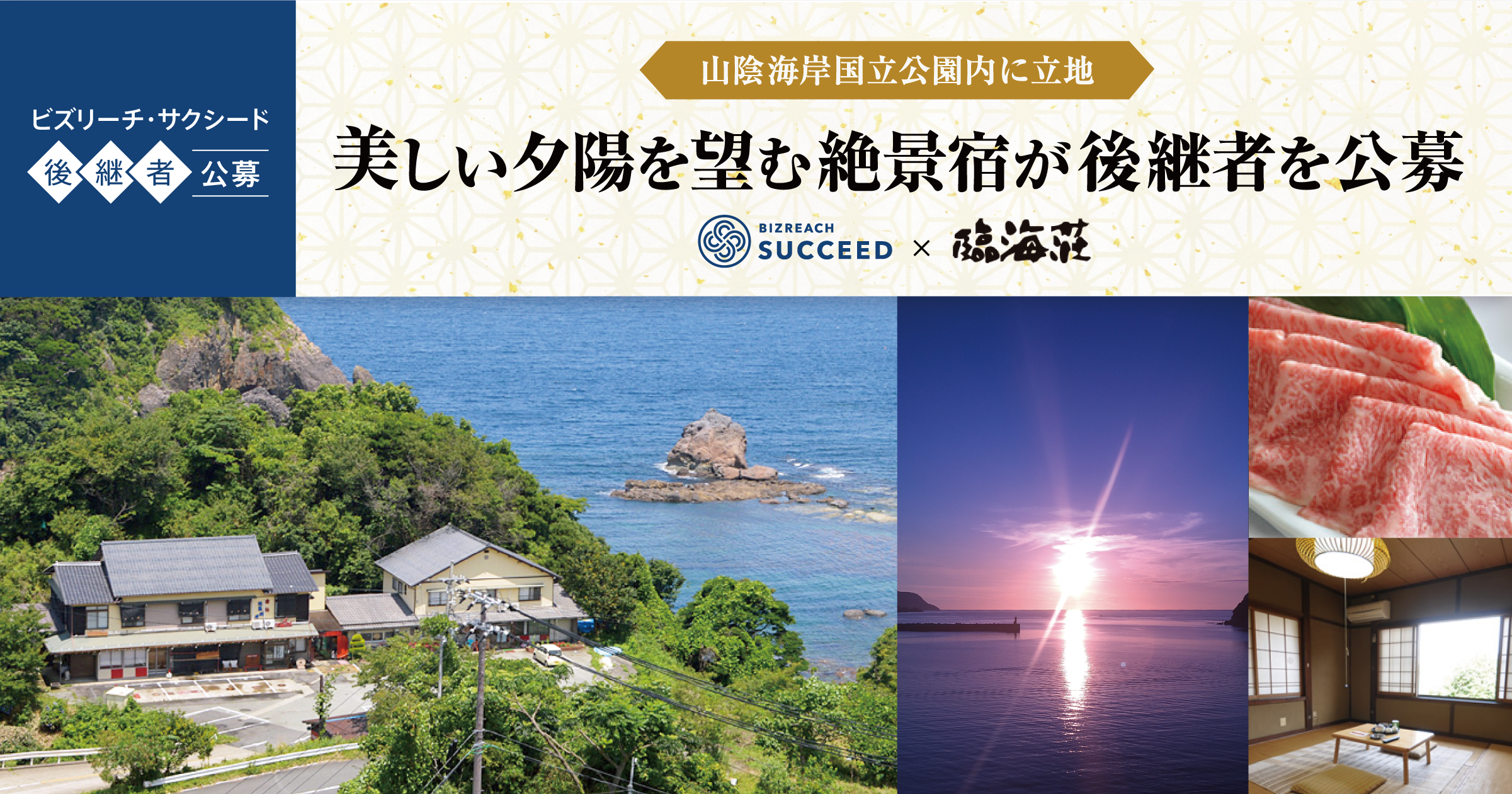 Visionalグループのビジョナル・インキュベーション株式会社(所在地:東京都渋谷区/代表取締役社長:村田 聡)が運営する事業承継M&Aプラットフォーム「ビズリーチ・サクシード」(https://ma-succeed.jp/)は、事業を譲りたい経営者がオープンに譲り受け企業を公募する「ビズリーチ・サクシード 後継者公募」を2021年8月17日に開始しました。第1弾として、山陰海岸国立公園内に立地する旅館「臨海荘」を運営する株式会社今子浦臨海センター(所在地:兵庫県/以下、臨海荘)が、後継者不