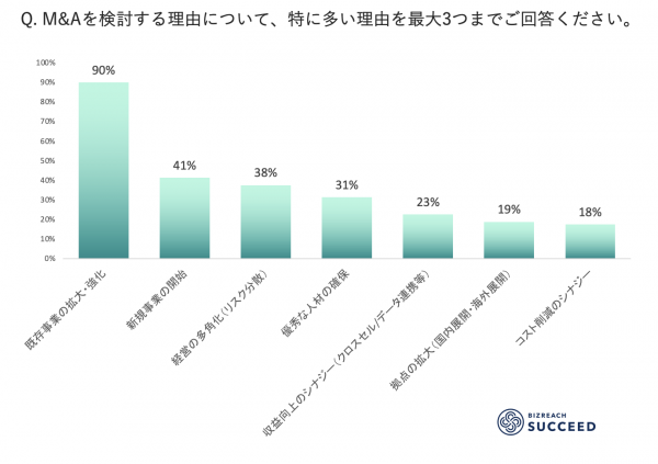 ・M&A検討理由:1位「既存事業の拡大・強化」90%、2位「新規事業の開始」41%、3位「経営の多角化(リスク分散)」38%